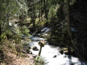 Sur le domaine amont, le cours d'eau est étroit et sa ripisylve est le plus souvent très développée. La faible luminosité et les forts taux de dilution des éléments inorganiques inhibent la production de matière organique par photosynthèse (production primaire) mais de grandes quantités de matière organique allochtone tombent dans le ruisseau. Par conséquent, la respiration (transformation de la matière organique en éléments minéraux) est plus importante que la production primaire (rapport P/R < 1, hétérotrophie). C'est dans ce domaine que la diversité des ressources trophiques disponibles est la plus grande.