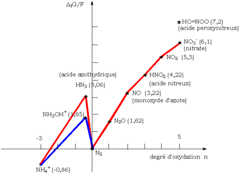 Le diagramme de Frost à pH =0 de l'azote montre bien que le monoxyde d'azote est instable et qu'il devrait se dismuter en diazote et en acide nitrique. Il est en fait très aisément oxydé en dioxyde d'azote, plus stable, par l'oxygène de l'air. C'est pourquoi on observe les vapeurs rousses de ce dernier gaz quand on oxyde le cuivre par l'acide nitrique concentré.