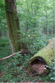 Parc National de Bialowieza (Pologne), exemple de milieu européen reconnu à haute valeur de naturalité. Le tronc présent sur la photo a été scié ou tronçonné, mais le milieu évoque ce qu'on imagine qu'il serait en l'absence d'intervention humaine
