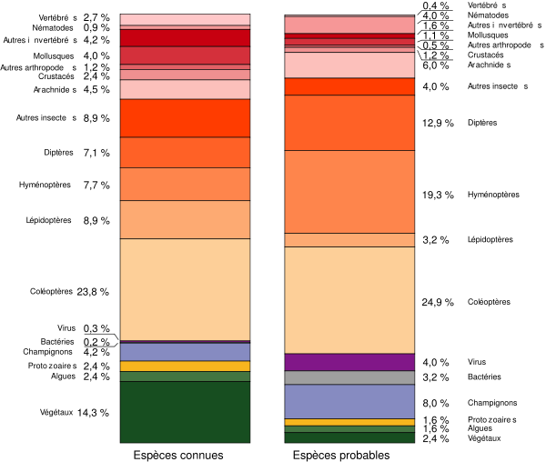 - ↑ Cette estimation très haute de May (1988) reflète plutôt une estimation des espèces existantes plutôt que celles seulement décrites.
